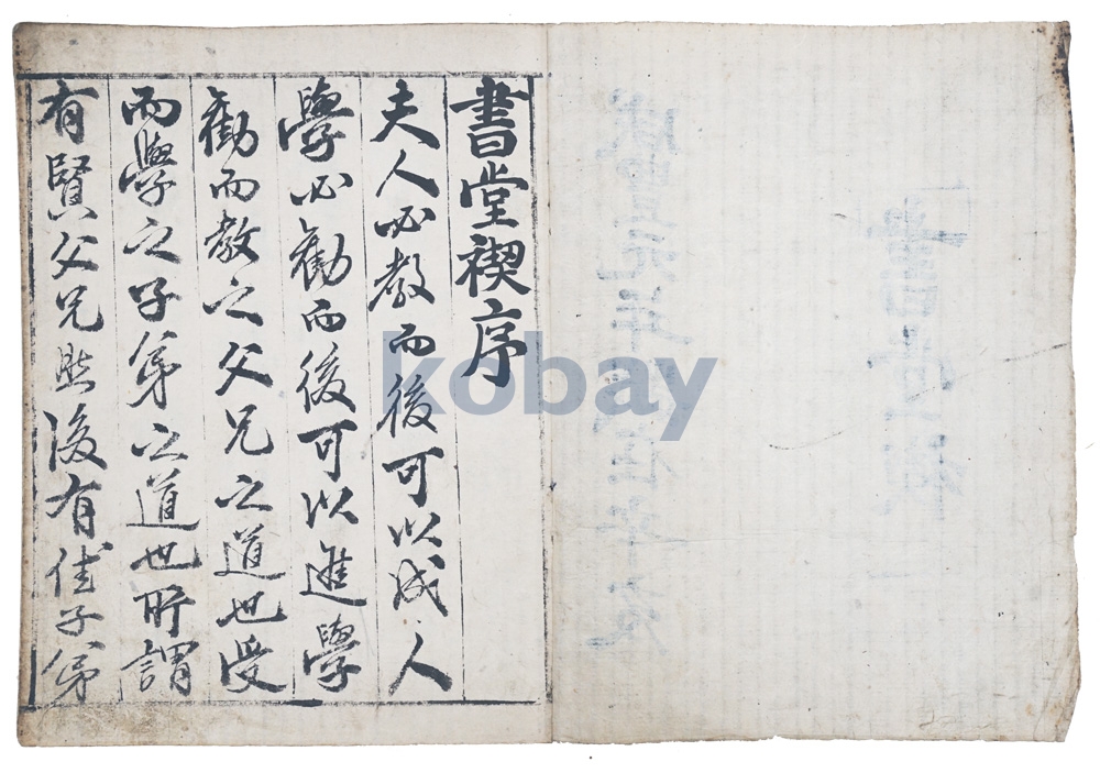 寫本《書堂禊》는 進學을 勉勵하기 爲하여 맺은 禊案이다. 卷頭에 金海人 金乃良이 1851年 陰曆 2月 初6日에 撰한 序文이 실려 있고, 末尾에는 1891年 陰曆 11月에 完山人 李之馨이 撰한 跋文이 收錄되어 있다. 全羅道 地域 文獻으로 보인다.
