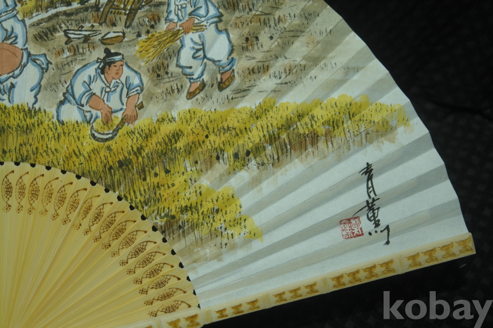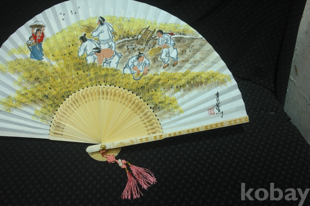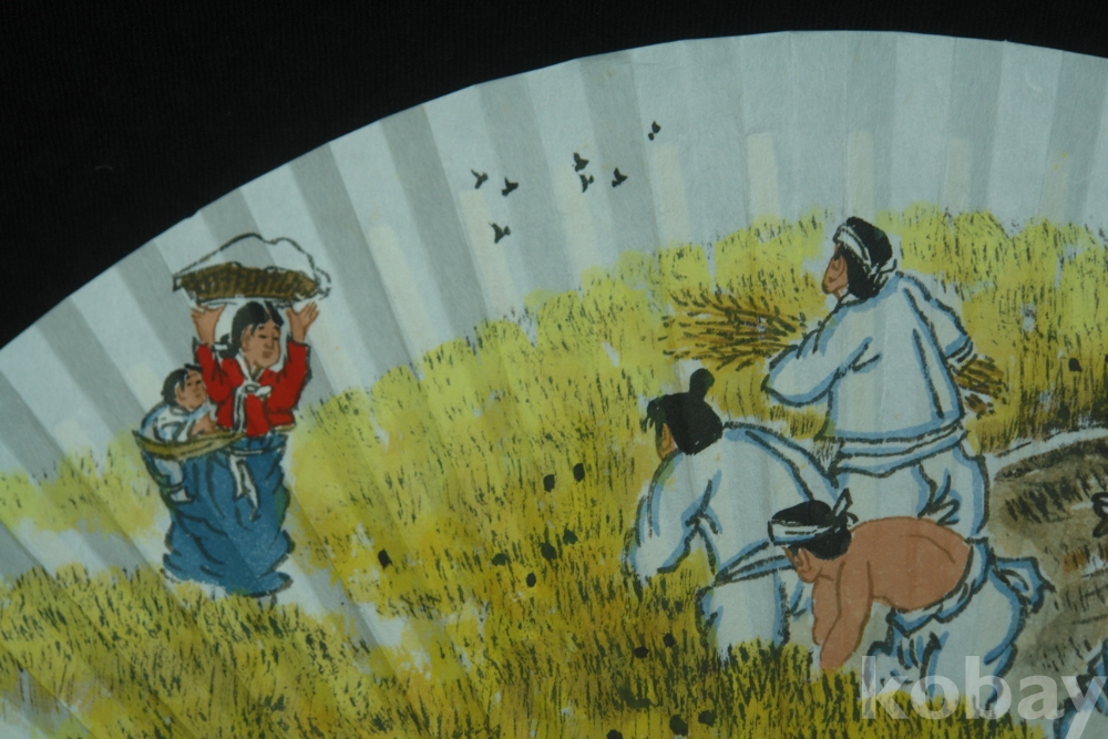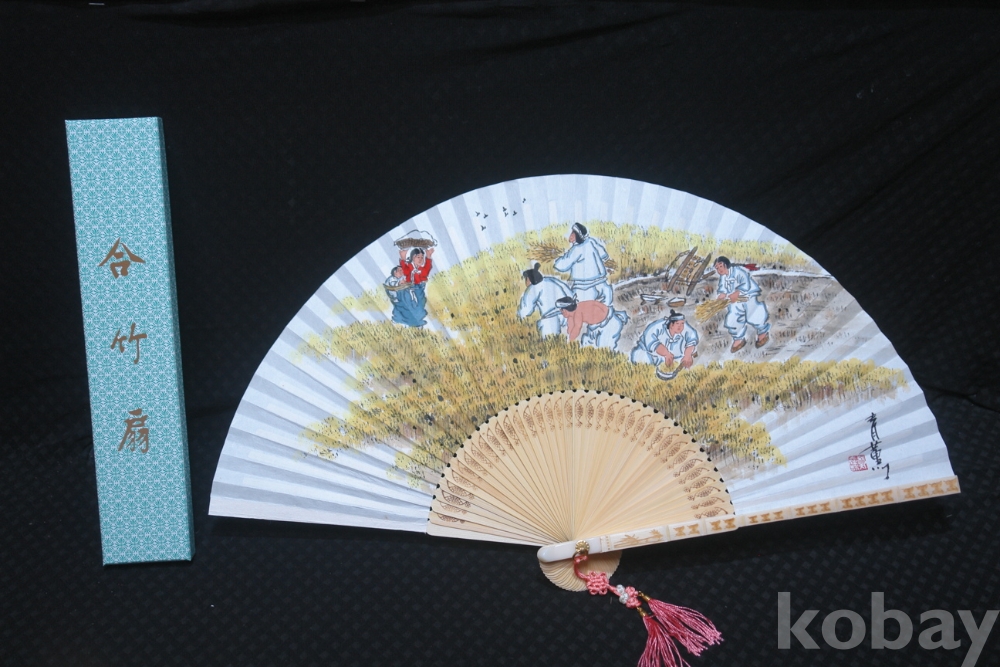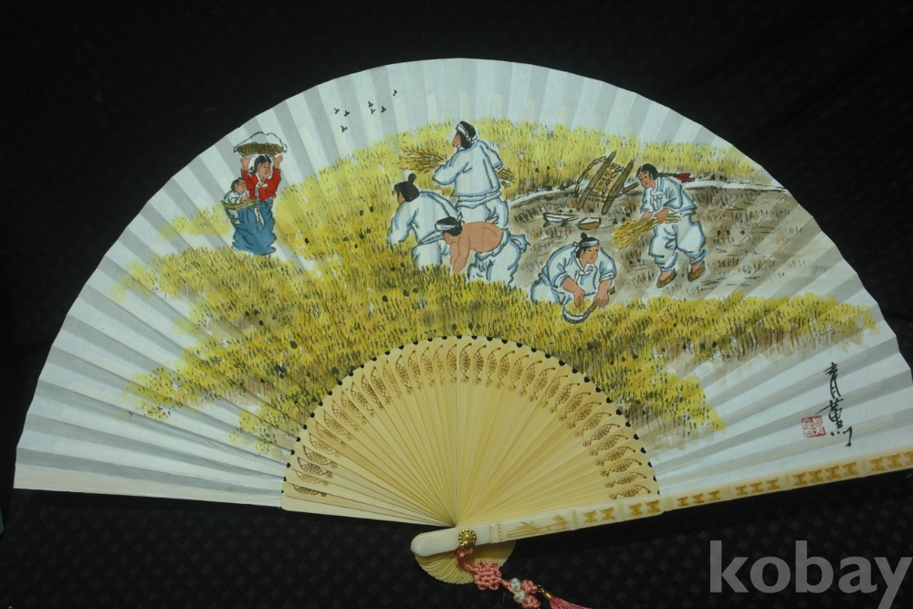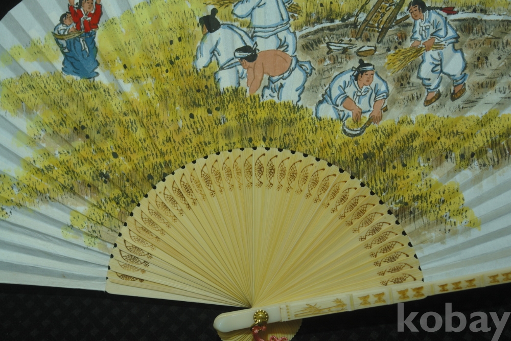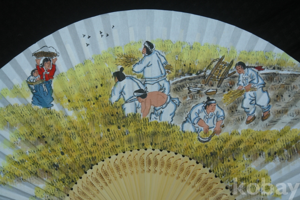 미사용 풍속화 고급부채 합죽선 추수 하는 들녁