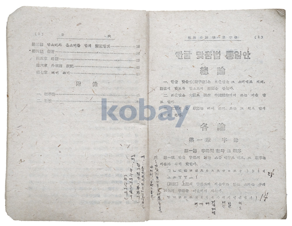 1948년 정부에서 공식적으로 채택함에 따라 그 뒤 우리나라 정서법의 법전(法典)이 되었다. 총론 3항, 각론 7장 63항, 부록 2항으로 구성되어 있다.