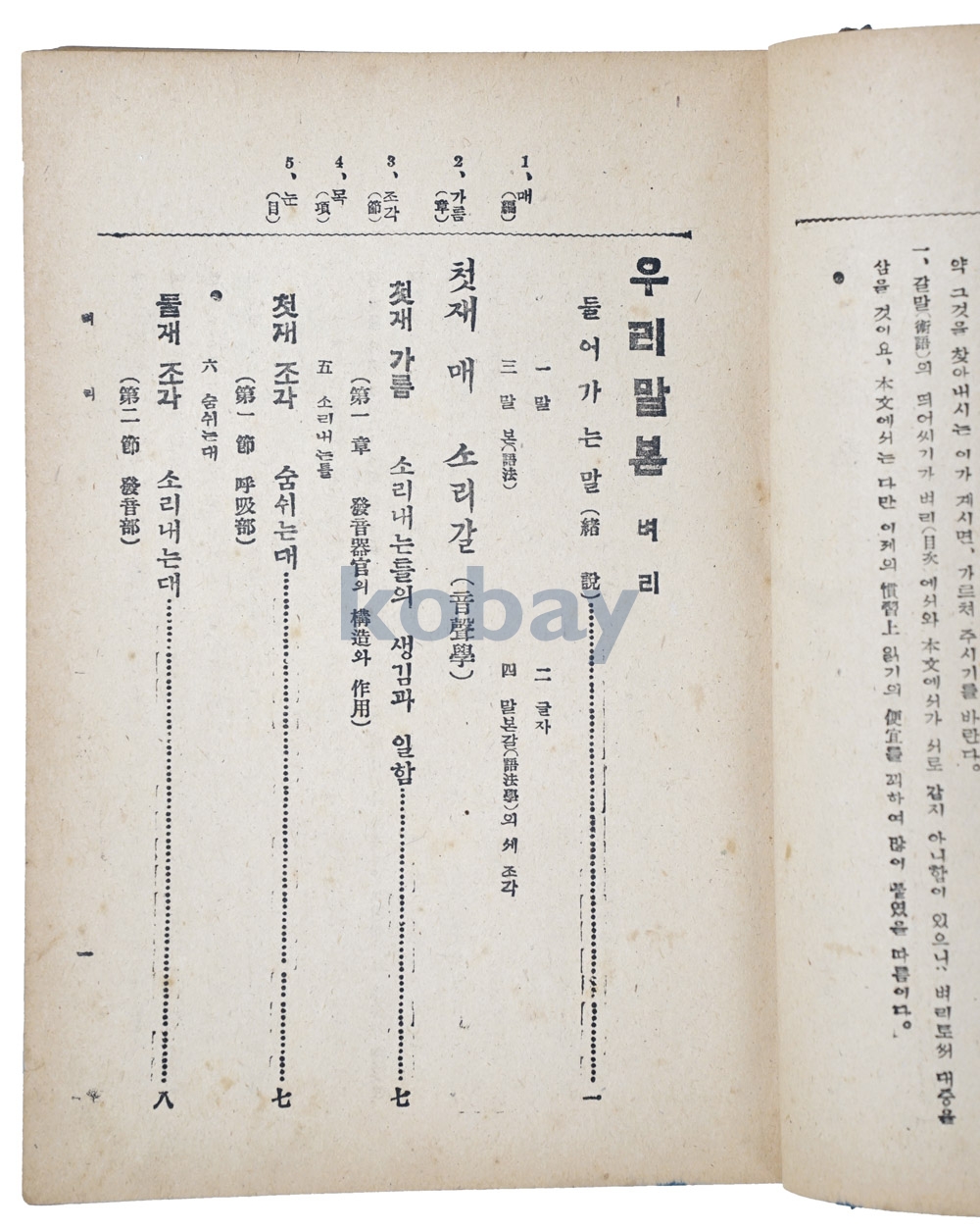 본문은 조선어문전음학, 조선어문법, 말의소리 총 3부로 나누어서 한글의 자음과 모음 특징, 소리의 종류 등 구체적으로 설명하고 있다. 이 외 부록으로는 훈민정음, 훈몽자회, 용비어천가, 세종어제월인석보 등 한글연구에 중요한 자료들의 원문을 발췌한 내용이 있다.