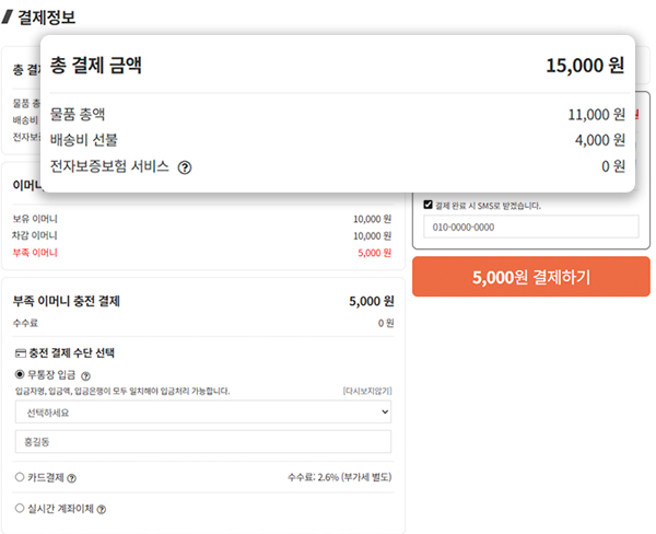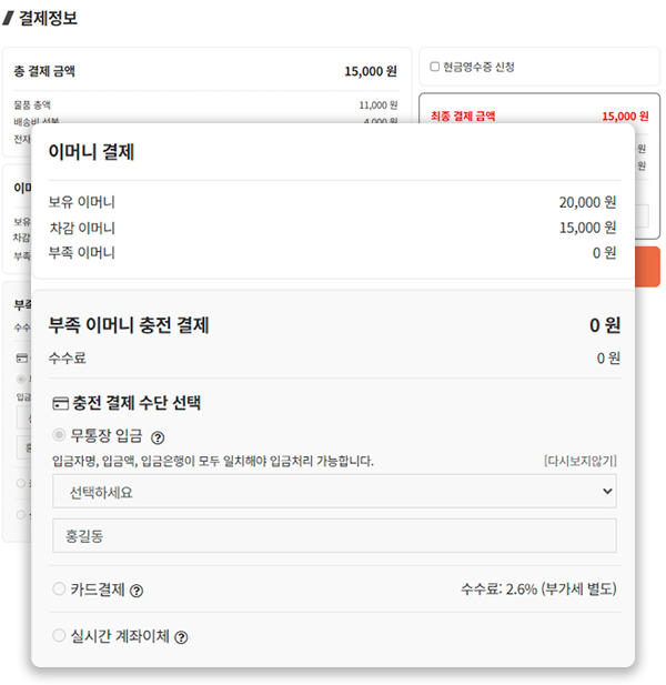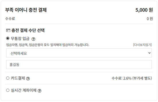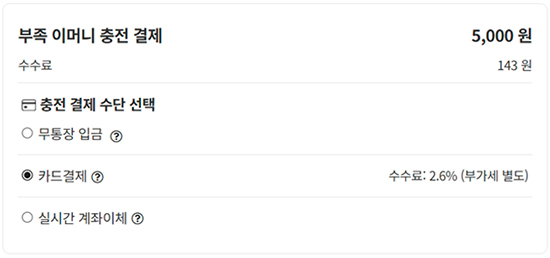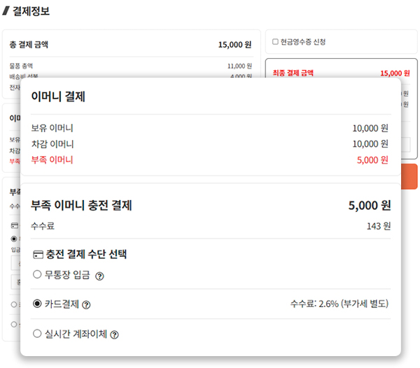 이머니가 부족할 경우, 충전 방법을 선택해주세요