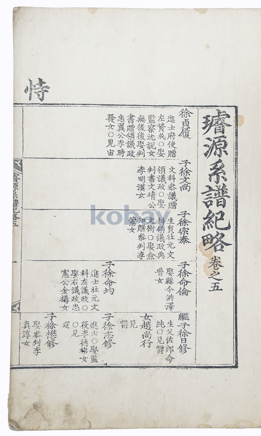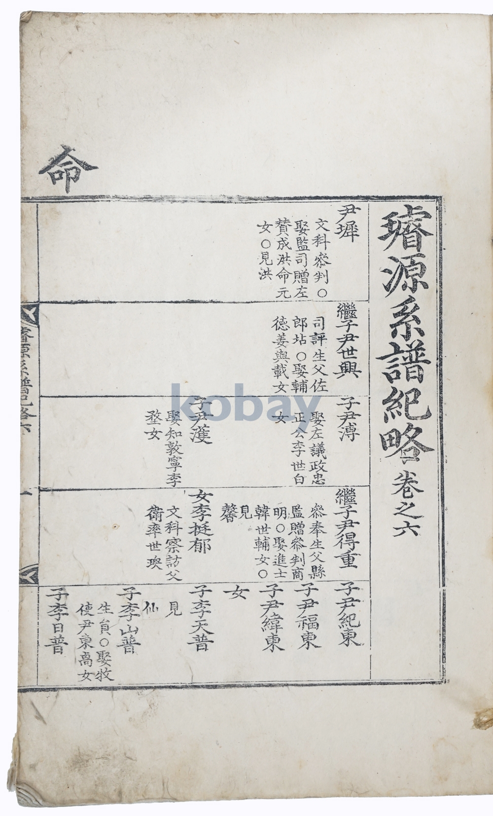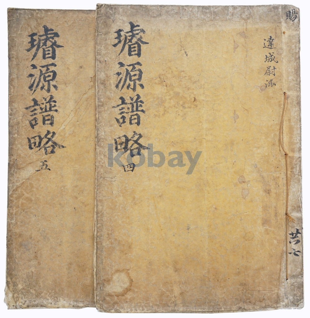 朝鮮時代 王室 族譜 木版本 [璿源系譜紀略] 卷5~6 2冊 零本의 各 冊 앞表紙 右側 上段 끝 部分에는, “賜”라고 墨書되어 있다.