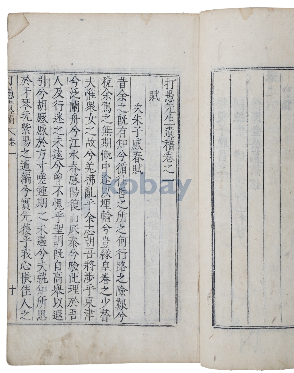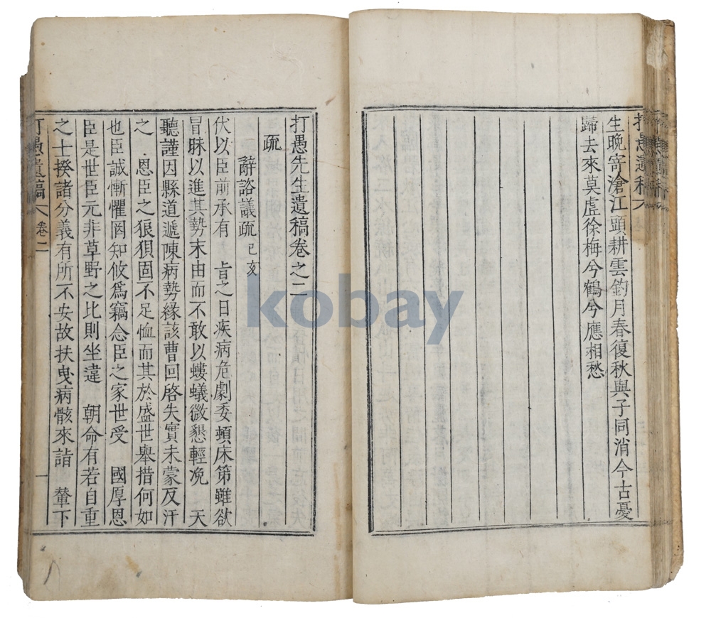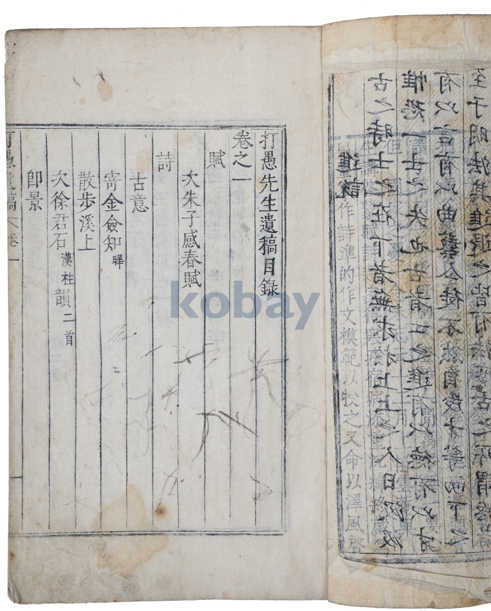 [打愚先生遺稿] 卷1~2 1冊 零本에는, 賦 ․ 詩 ․ 疏類의 文章이 收錄되어 있다.