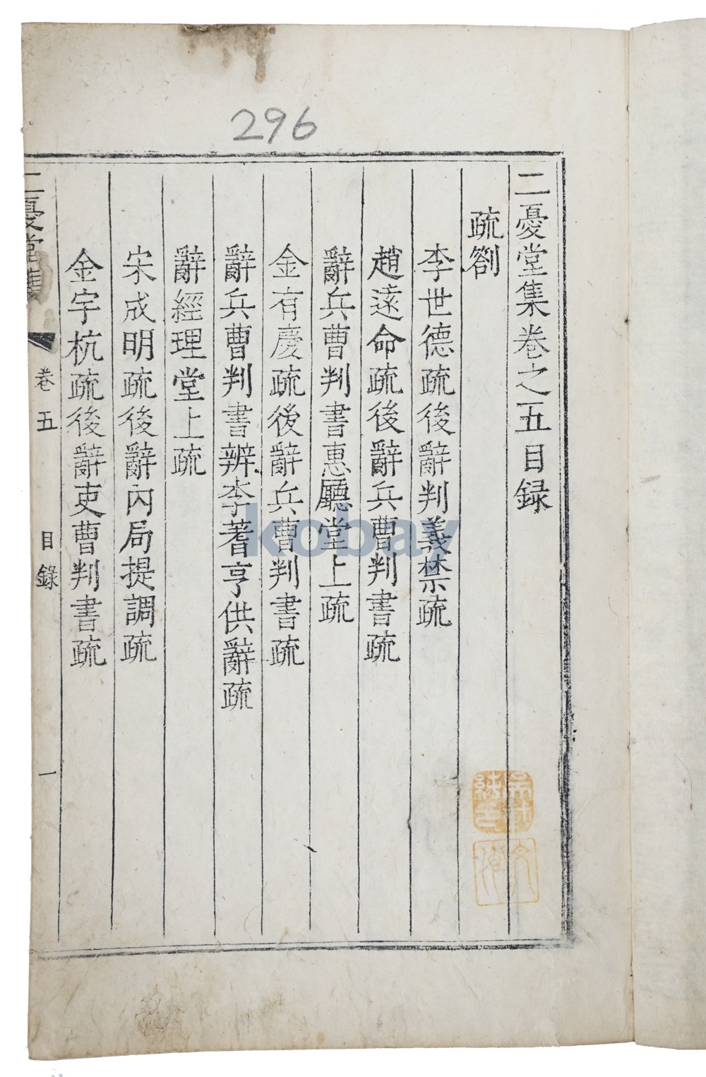 [二憂堂集] 卷5~6 末卷 1冊 零本의 卷頭에는, “吳載純印”․“文卿”이라고 새겨진 藏書印이 捺印되어 있다.