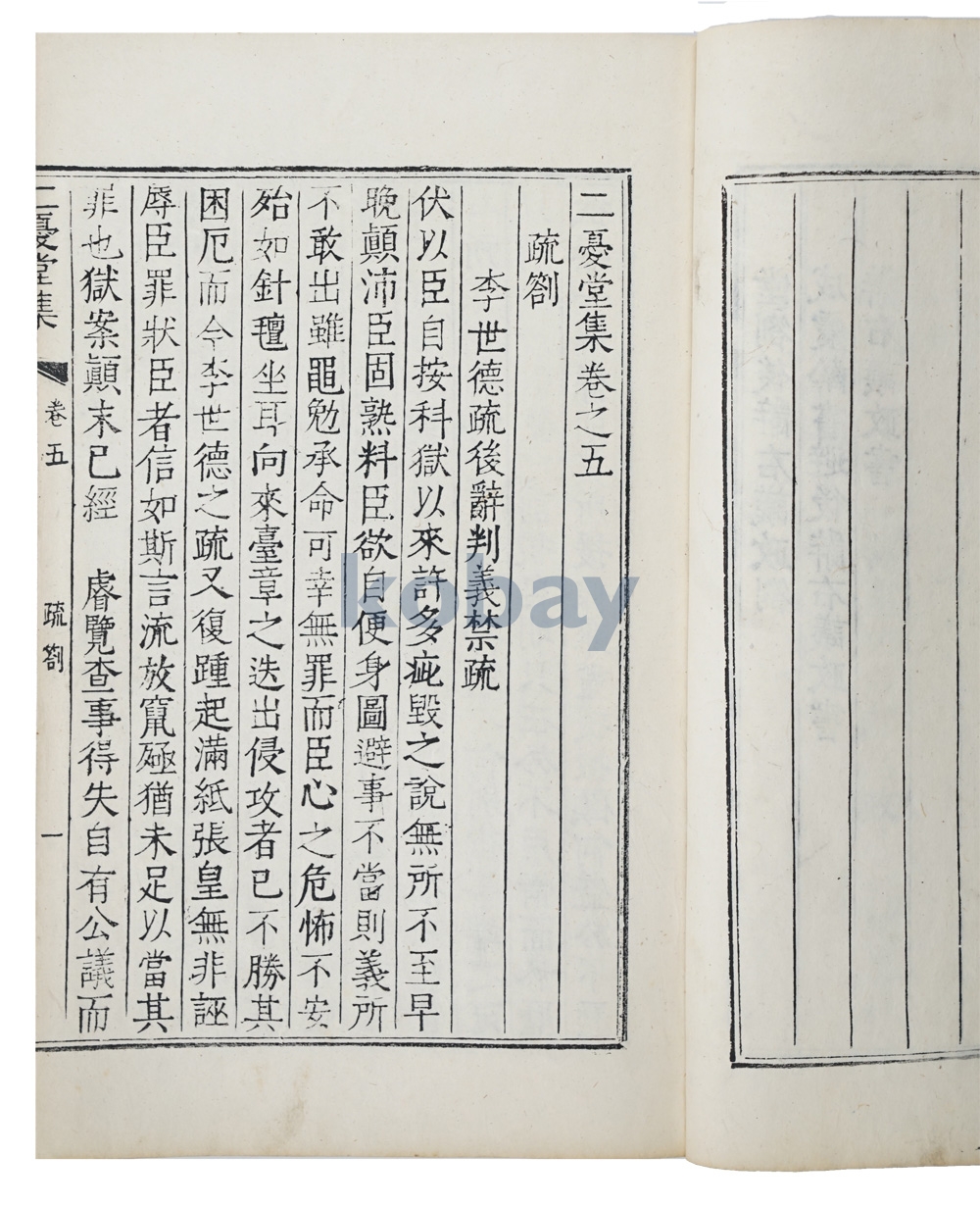 [二憂堂集] 卷5~6 末卷 1冊 零本에는, “疏箚 ․ 啓辭 ․ 議 ․ 應製文 ․ 墓表 ․ 銘” 等의 文章이 실려 있다.