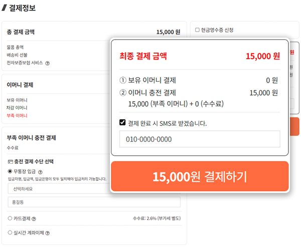 이머니가 부족할 경우, 충전 방법을 선택해주세요