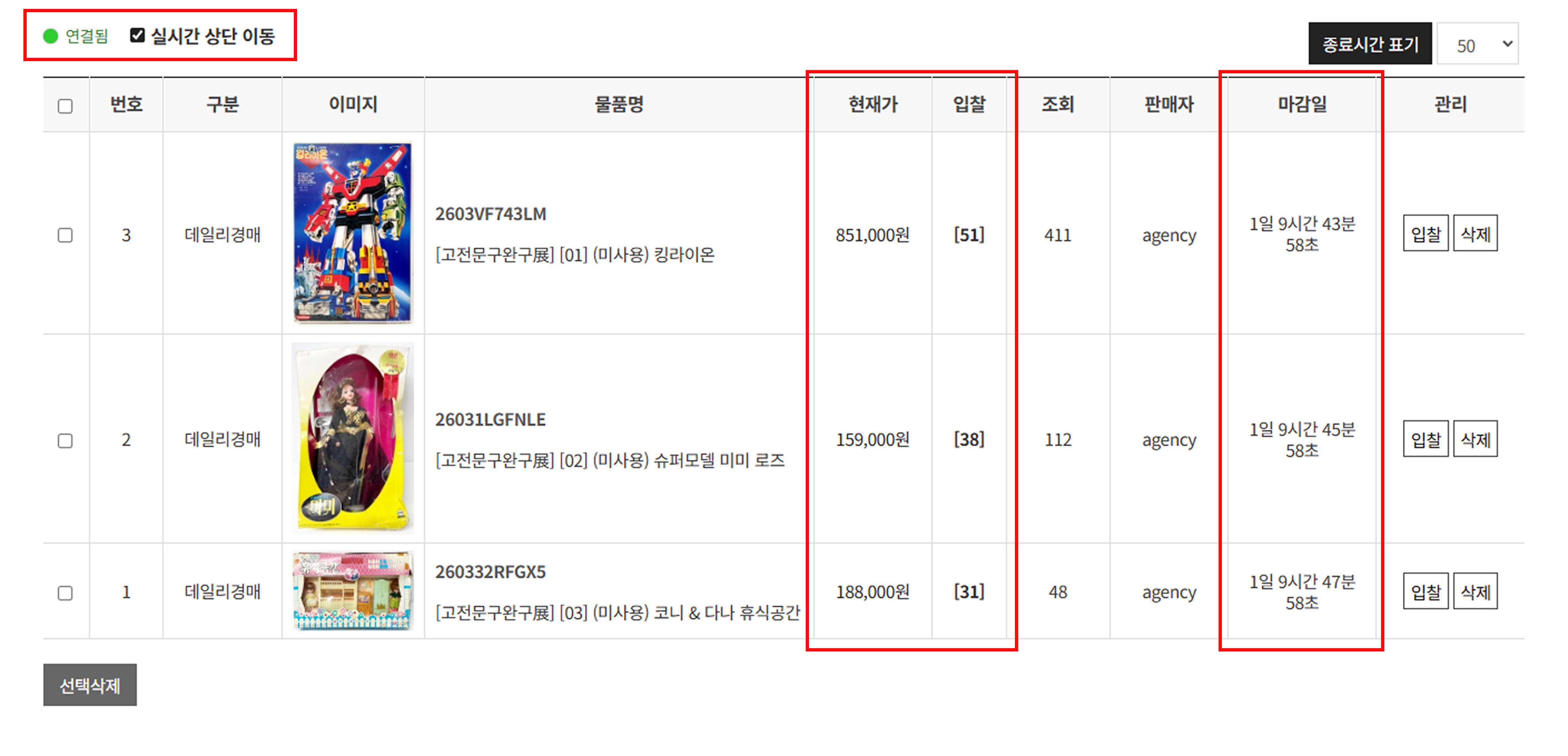 - 실시간 상단 이동 ‘실시간 상단 이동’을 체크할 경우 현재가 또는 입찰 횟수가 변경된 물품이 목록 상단으로 자동 이동합니다.