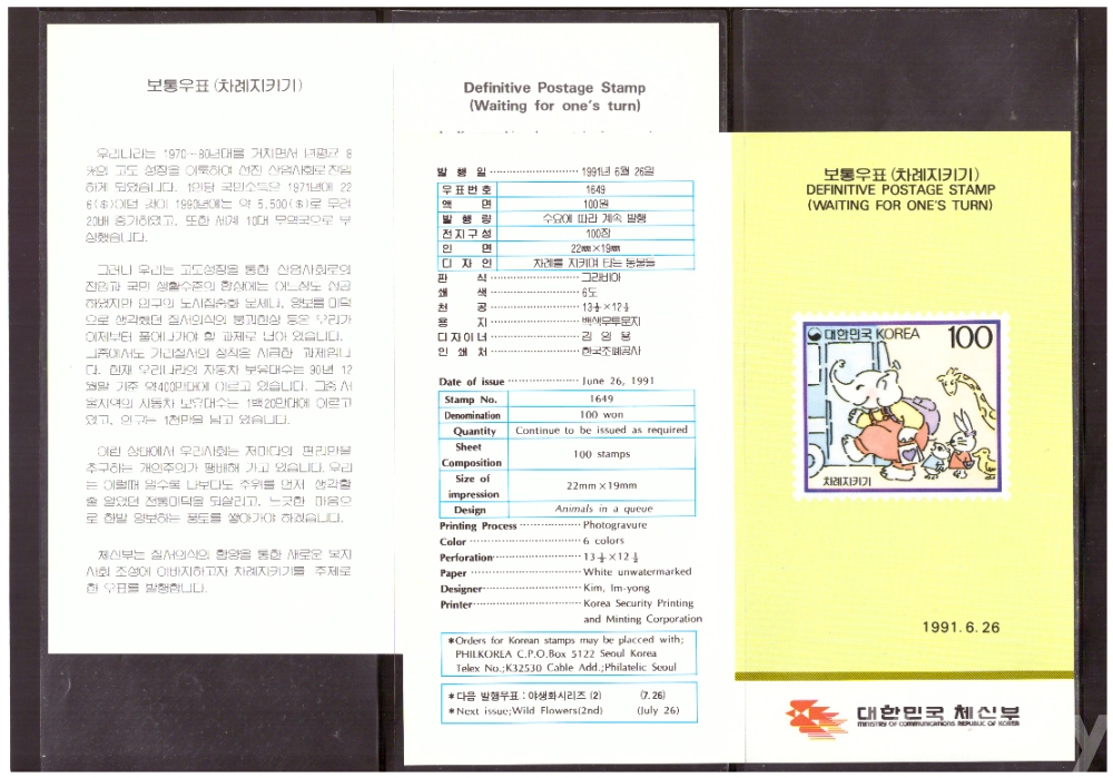 (안내카드) 1991.6.26 보통우표(차례지키기) (접지않음)