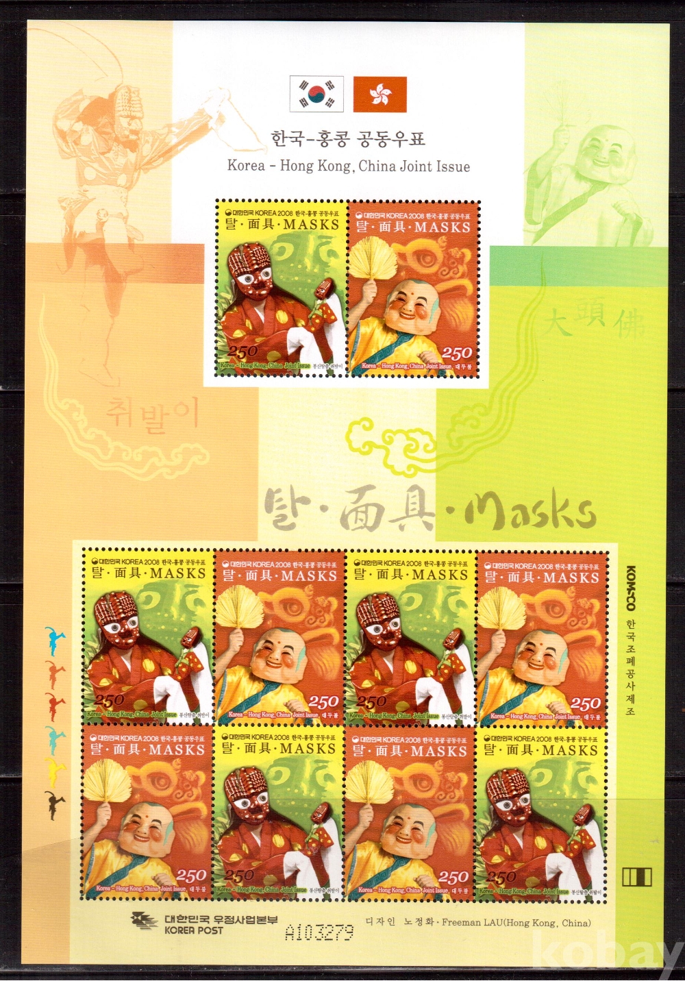 (한국전지) 2008.11.6 한국-홍콩 공동우표 sheet of 10 MNH