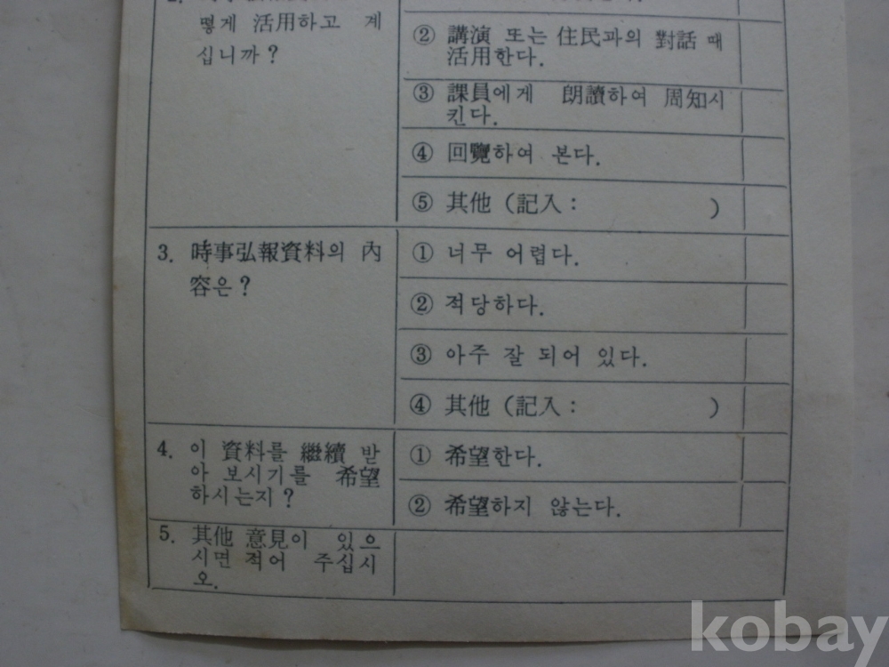 문화공보부 - "시사홍보자료" 설문 우편엽서 (1975년)