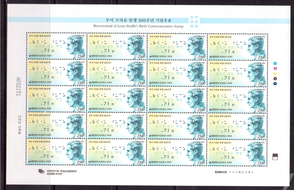 (한국전지) 2009.1.2 루이 브라유 탄생 200주년 sheet of 20 MNH
