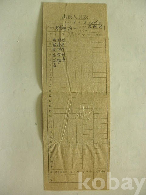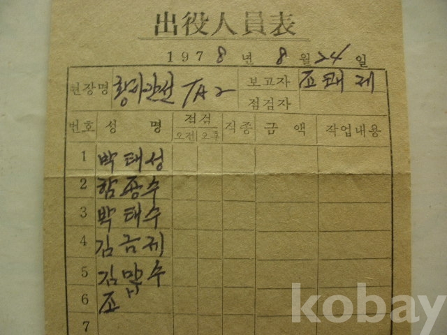 출역 인원표 - 황마간선 (1978년)