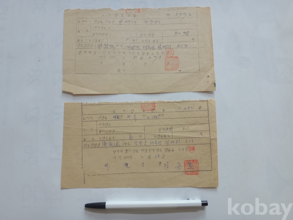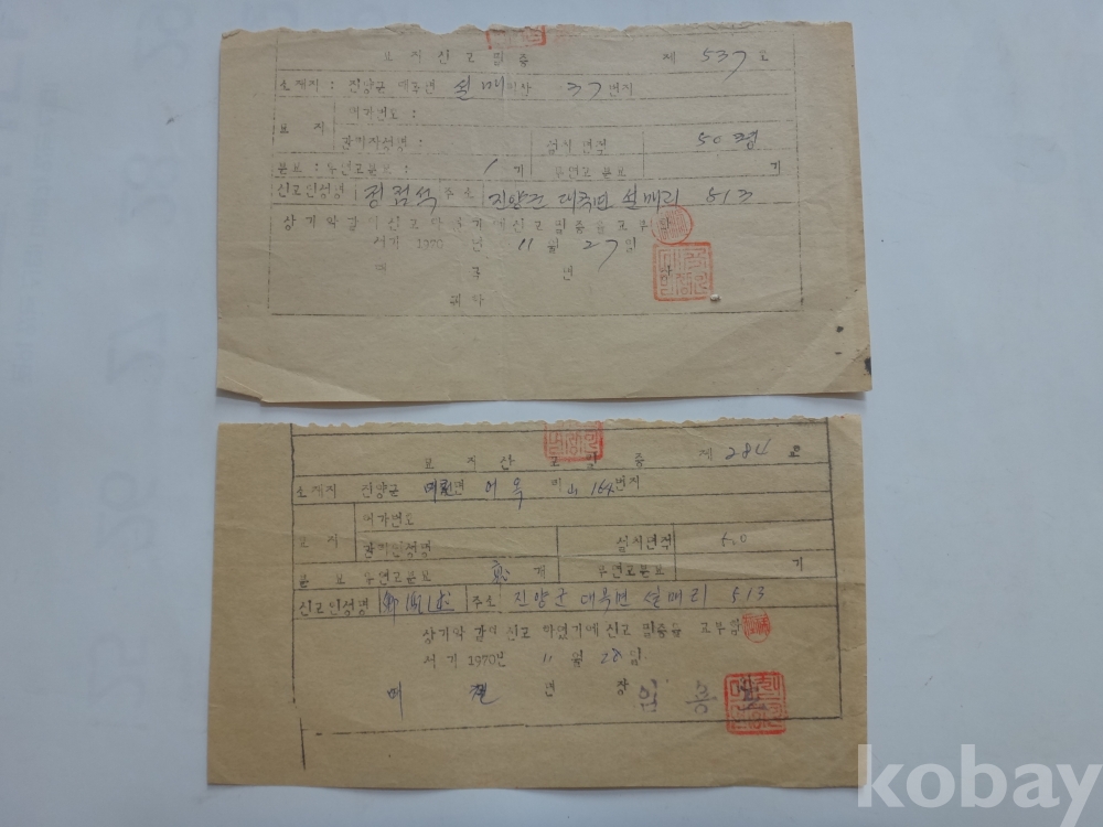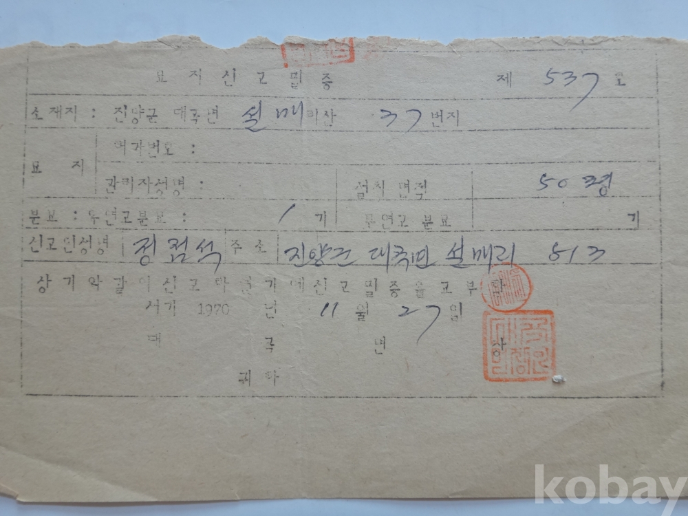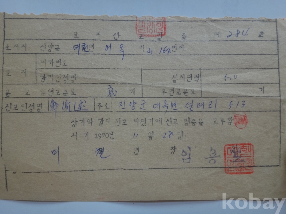 묘지 신고필증 - 진양군 대곡(여천)면 (2매일괄, 1970년)