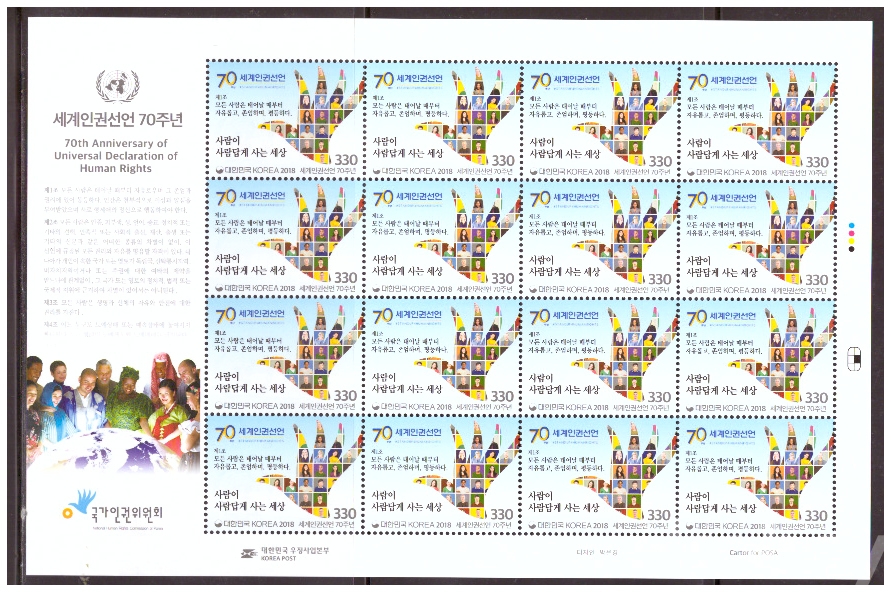 (한국전지) 2018.10.1 세계인권선언 70주년 sheet of 16 MNH