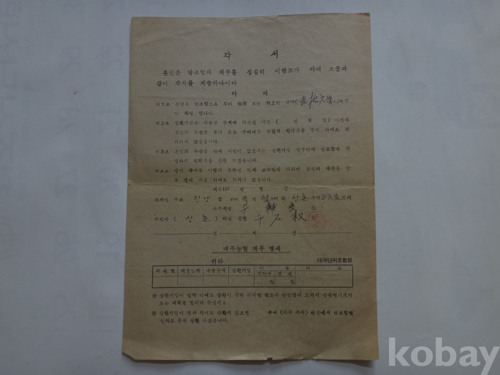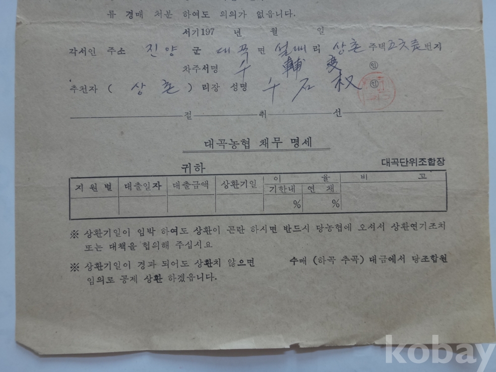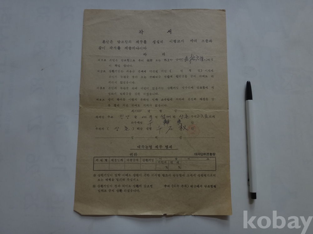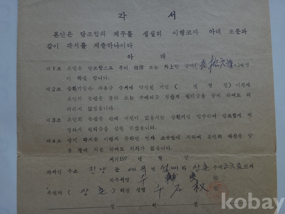 진양군 대곡단위조합 - 채무이행 각서 (1970년대