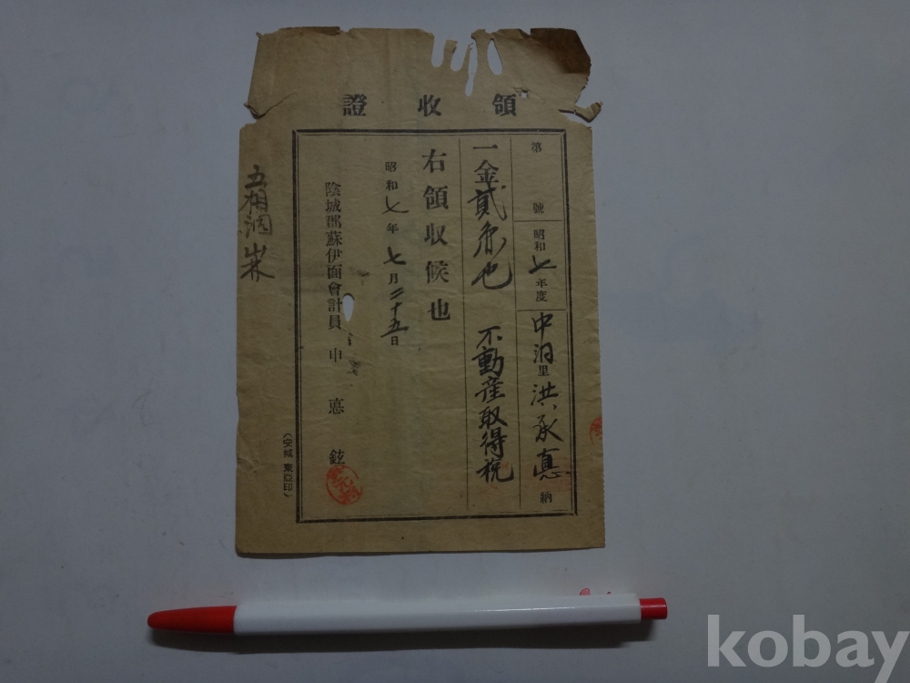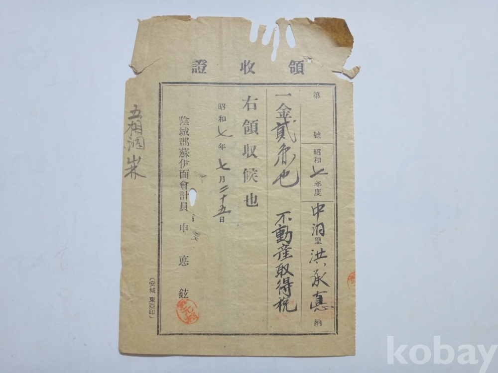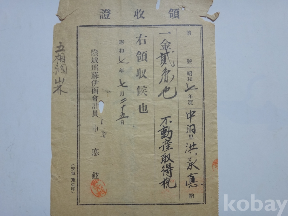 부동산 취득세 - 영수증 (소화7년, 음성군 소이면)