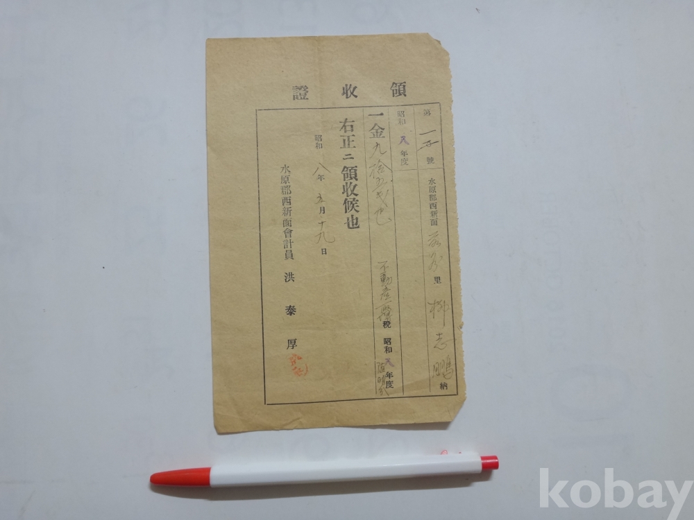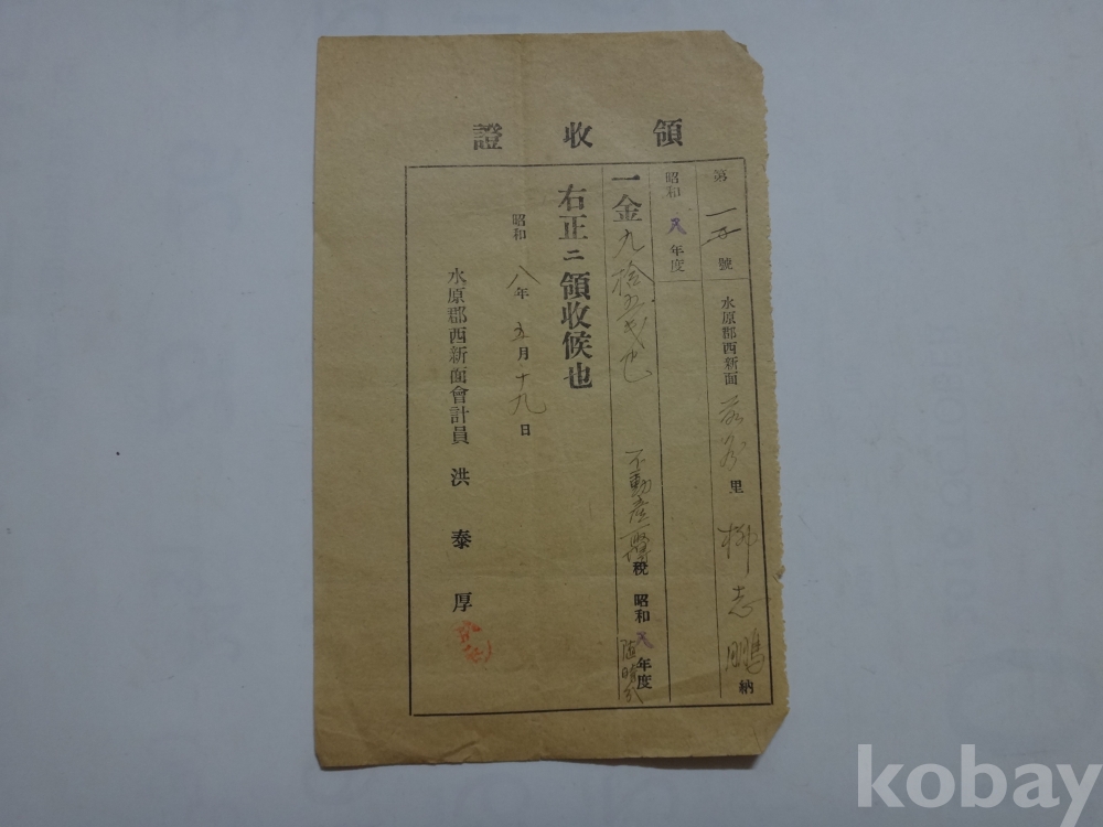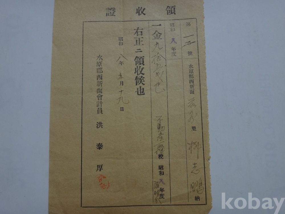 부동산취득세 - 영수증 (소화8년, 수원군 서신면)