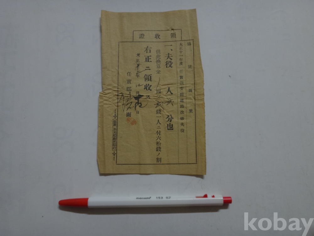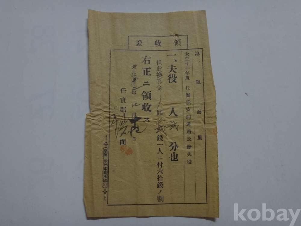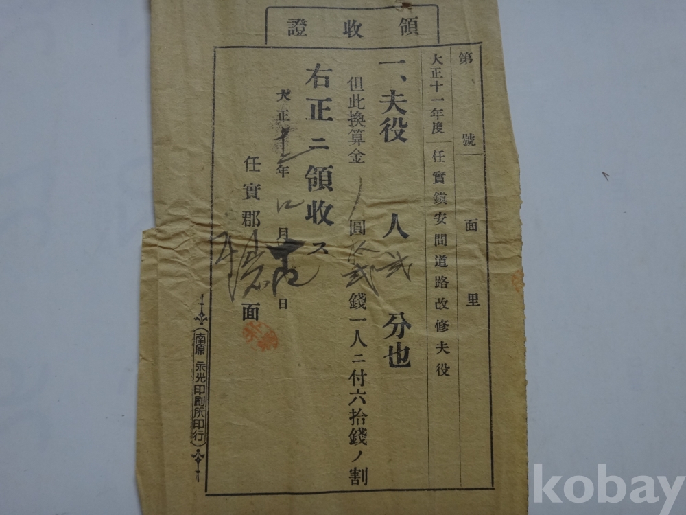 임실 진안간 도로개수 부역 - 환산금 영수증 (대정12년, 임실군)