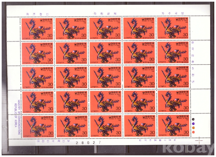 (힌국전지) 1980.2.20 한국미술 5천년-신구형주자 sheet of 25 MNH
