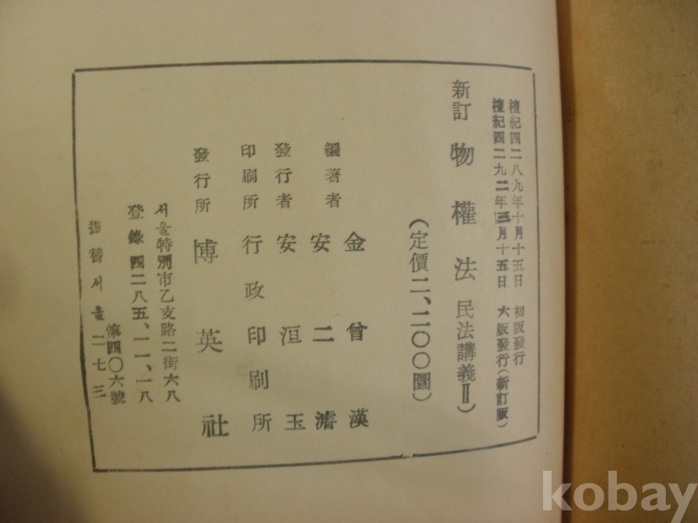 물권법 - 서울법대교수 김증한 · 안이준 편저 (1959년, 박영사)