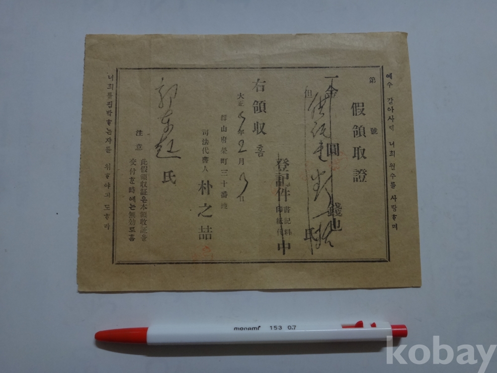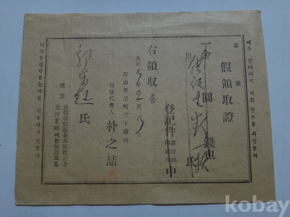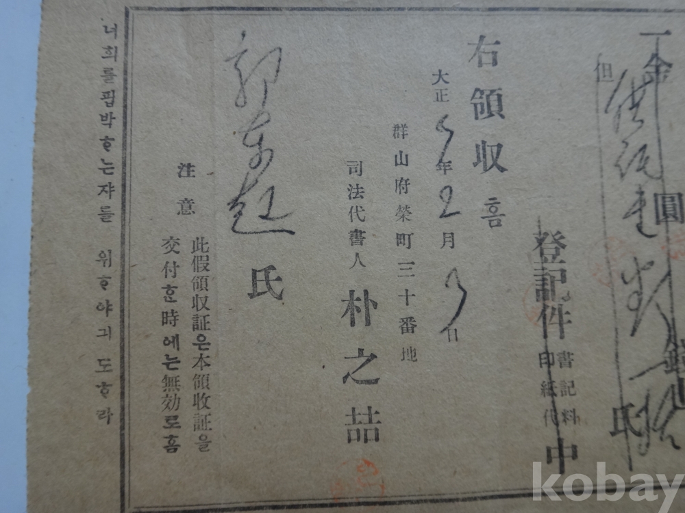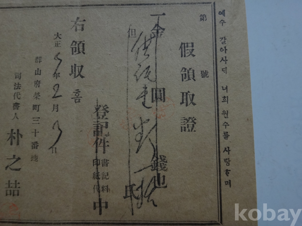 예수 갈아사대.. 군산부 사법대서인 - 등기건 서기료 및 인지대 영주증 (대정3년)