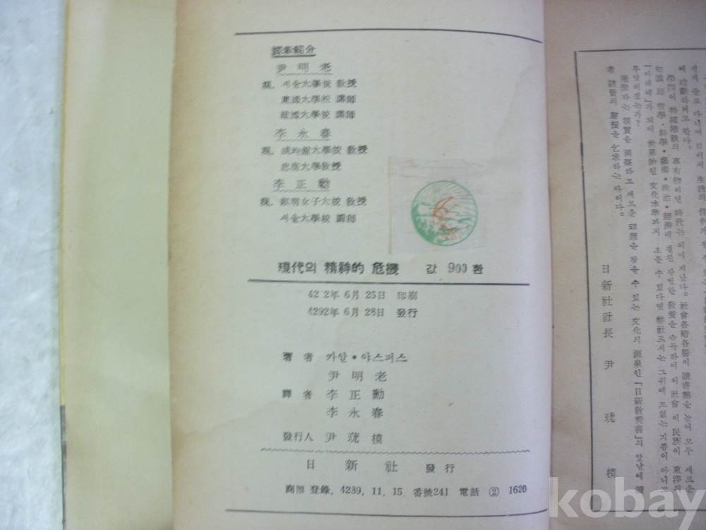 현대의 정신적 위기 - 카알 야스퍼스 저 (1959년, 일신사)