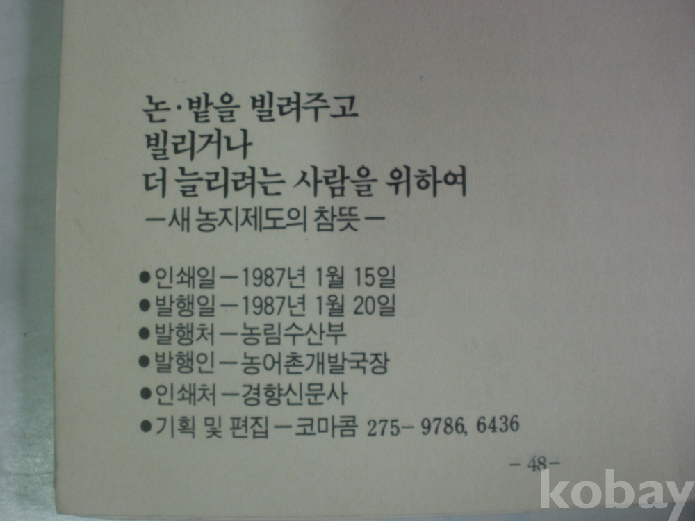 새 농지제도의 참뜻 - 논.밭을 빌려주고..(1987년, 농림수산부)