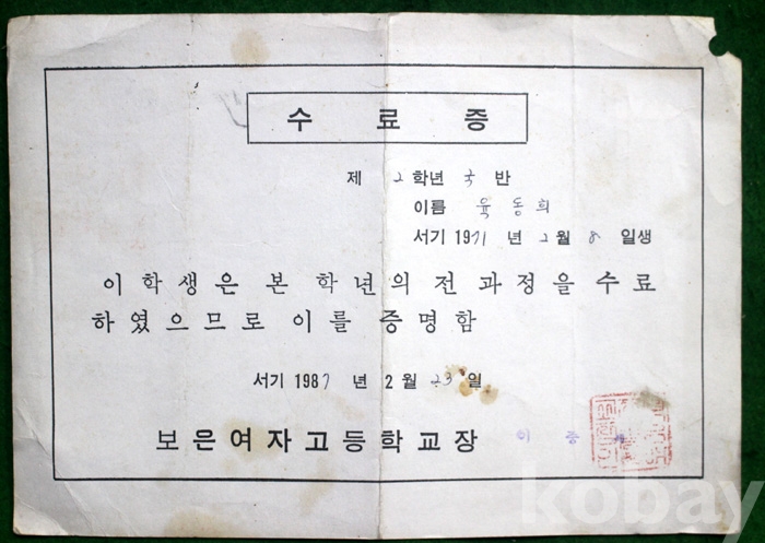 (상장 및 졸업장) 1987년 보은여자고등학교의 수료증 ...