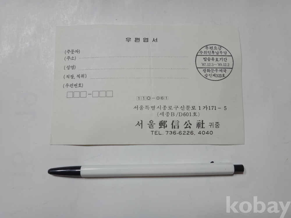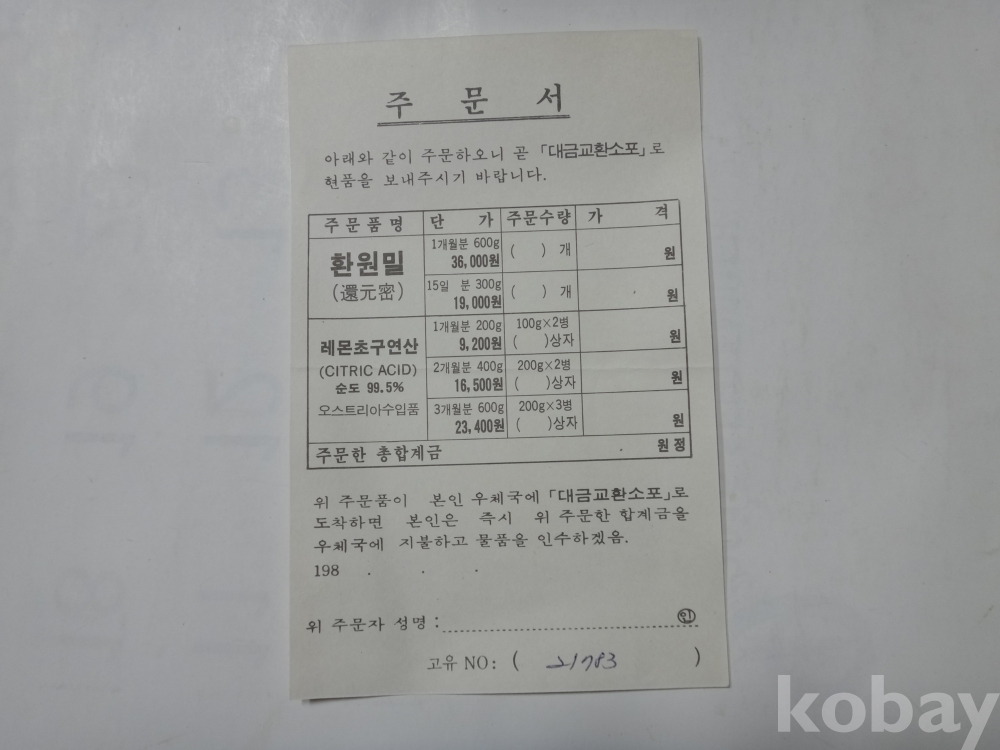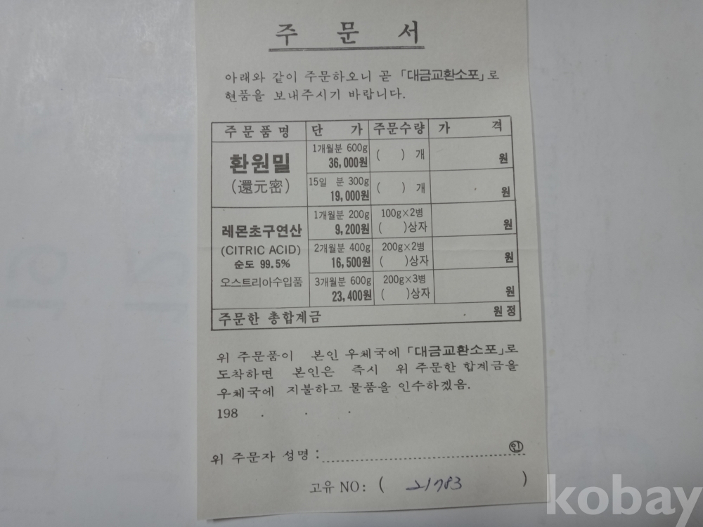 환원밀, 레몬초구연산 - 주문서 (광화문우체국 후납 발송유효기간 1987~1989년)