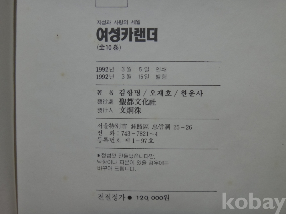 여성 캘린더 - 이별속의 만남 (1992년, 김항명, 오재호, 한운사 저, 성도문화사)