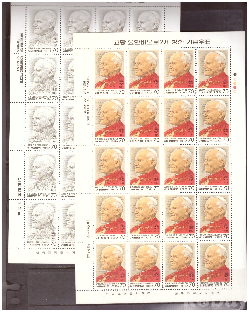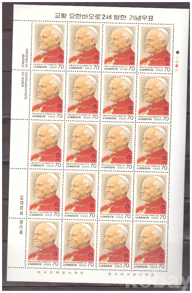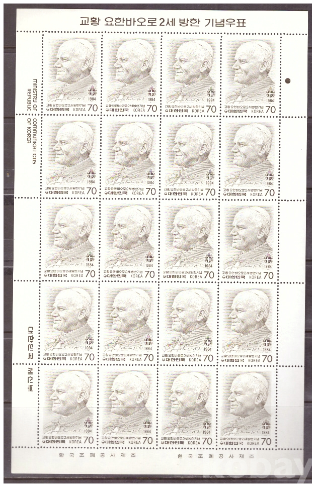 (한국전지) 1984.5.3 교황 요한바오로2세 방한 2완 sheet of 20 MNH