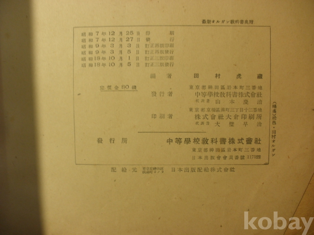 오르간 교과서 (소화 18년, 동경 중등학교교과서 주)