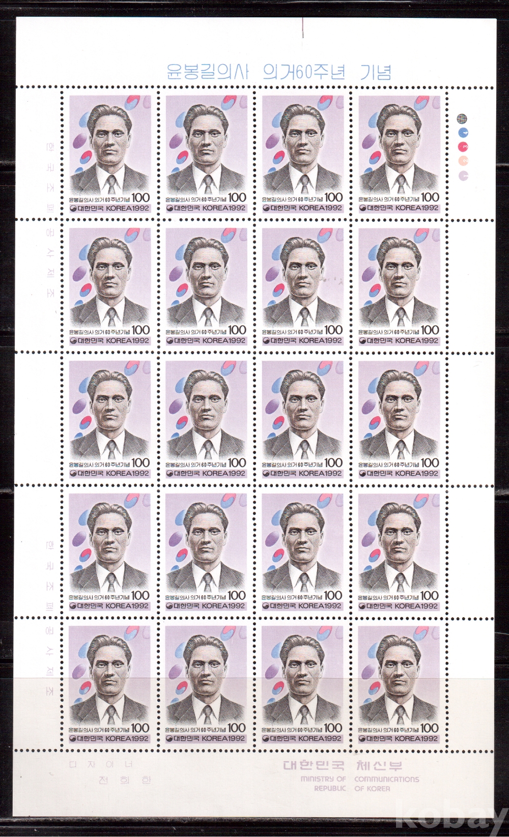 (한국전지) 1992.4.29 윤봉길의사 의거 60주년 sheet of 20 MNH