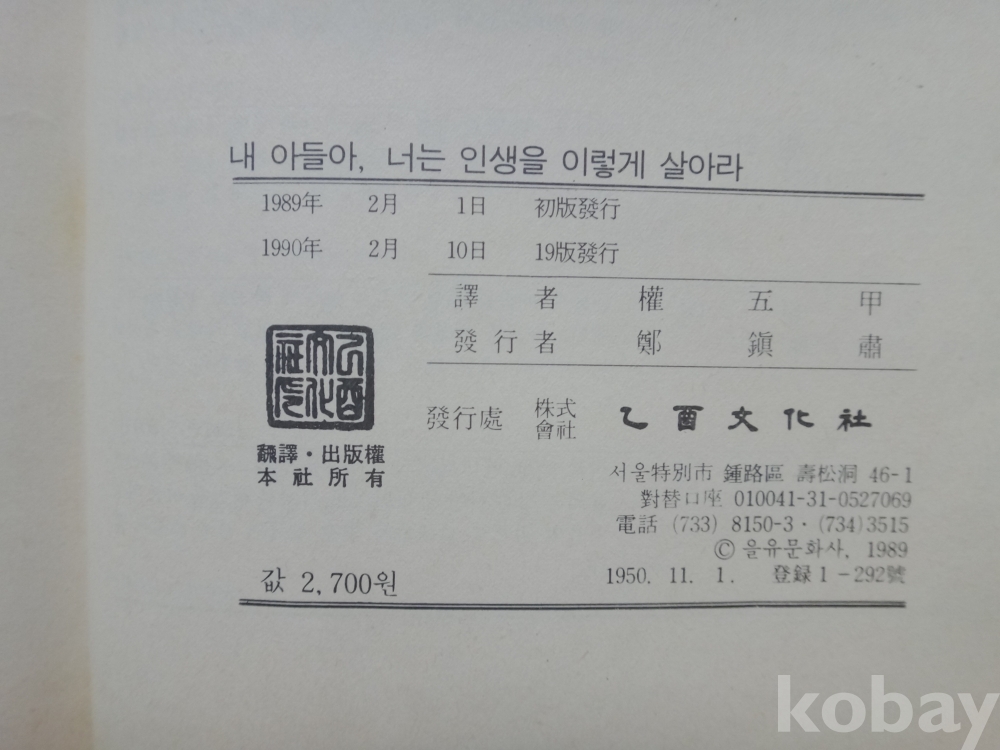 내 아들아 너는 인생을 이렇게 살아라 - 아버지가 아들에게 보내는 인생 최대의 교훈 (1990년, 필립 체스터필드 저, 권오갑 역, 을유문화사)