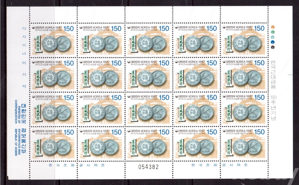 (한국전지) 1997.2.19 한국근대금융 100주년 sheet of 20 MNH