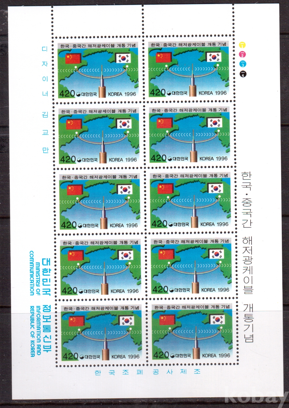 (한국전지) 1996.2.8 한국-중국간 해저케이블 개통 sheet of 10 MNH