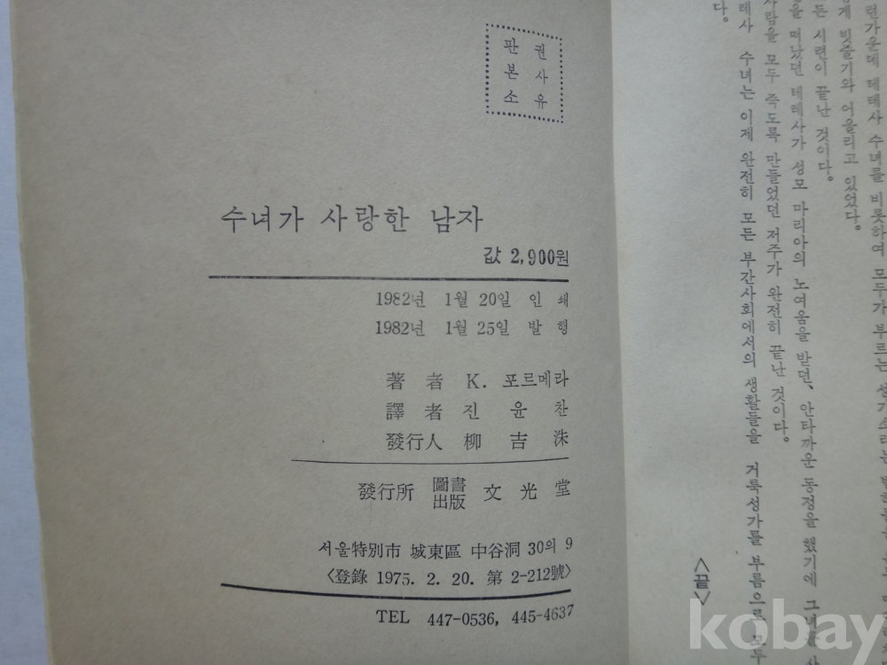 수녀가 사랑한 남자 - 나는 한 여자로서 사랑을 할 수 없나요 ? (1982년, K.포르메자 저, 진윤찬 역, 문광당)