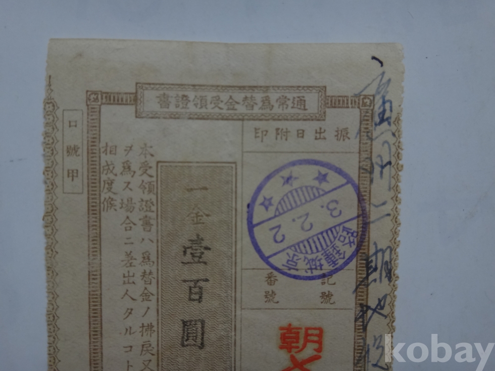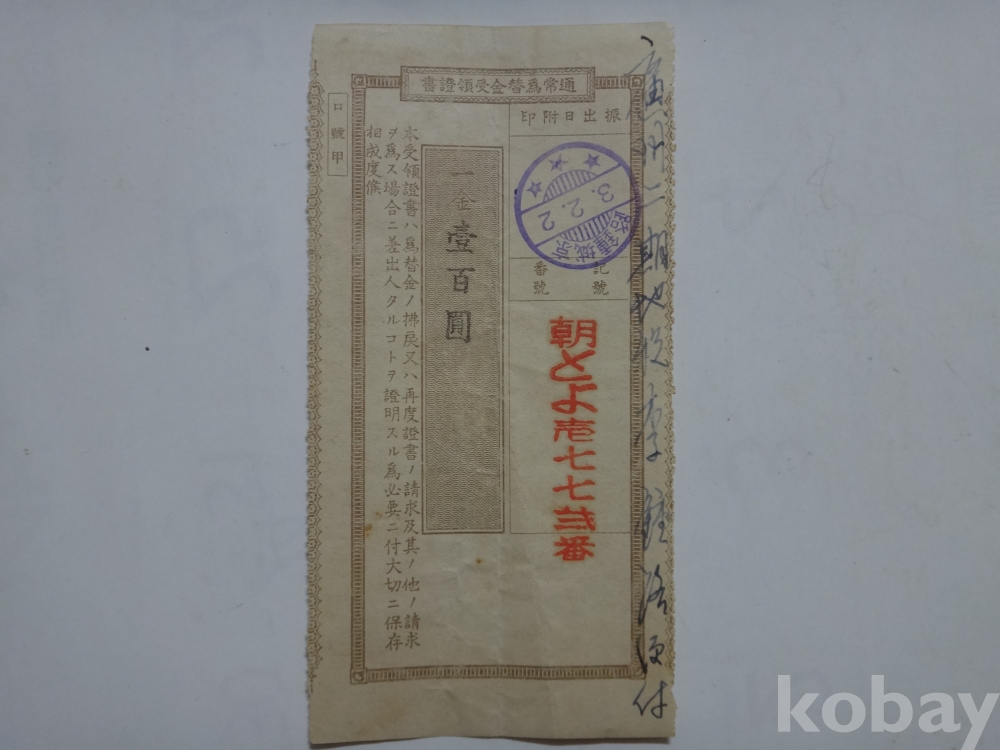 통상위채금 수령증서 - 경성 종로 인 (일백원, 광주...)