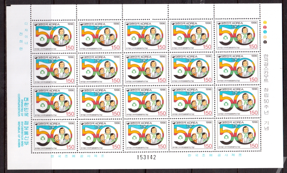 (한국전지) 1996.5.10 한국걸스카우트 창립 50주년 sheet of 20 MNH