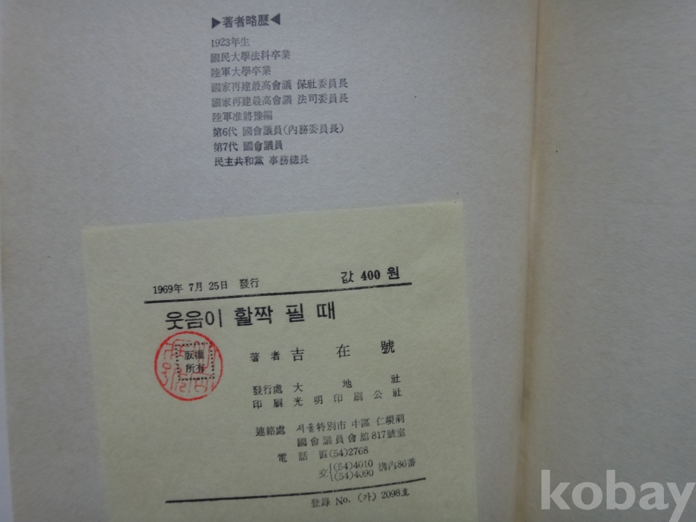 웃음이 활짝 필때 - 전 국회의원 길재호 저 (1969년, 대지사)