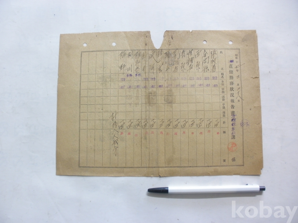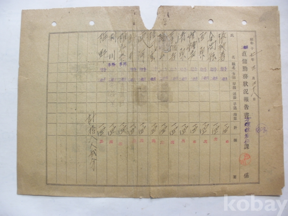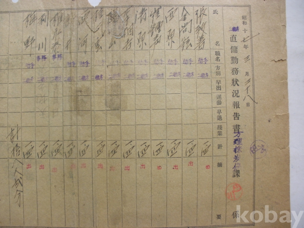 산증 (疝症) 의는..삼눈 백태의는..(뒷면, 직용 근무상황 보고서 - 방리 채탄계, 소화17년)