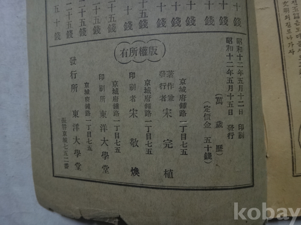 응양력 대조 - 만세력 (소화12년, 경성부 종로 동양대학당)