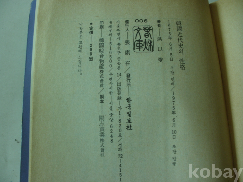 한국 근대사의 성격 (1975년, 홍이섭 저, 한국일보사)