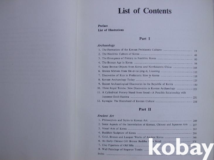 본문은 목차 뒤에 도판 목록이 있으며, 전체를 2부분으로 나누어 앞에 고고학 관련 논문 12편을 싣고 2부에 고미술 논문 8편을 사진도판들과 함께 수록한 것이다. 간혹 원색도판도 섞여 있다. 우리 고미술사학계의 태두인 저자가 한국 미술을 세계에 알린 저서이다.