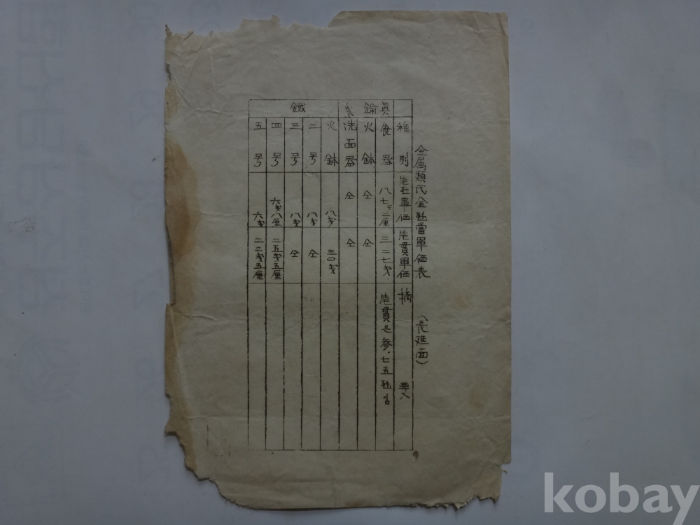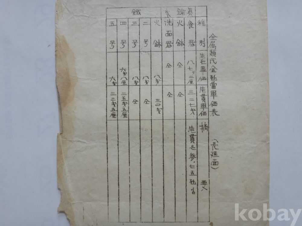 금속류 대금 단가표 - 식기, 세면기, 화발 등 (일제강점기, 장연면)