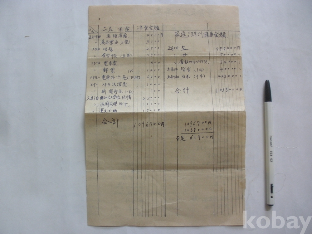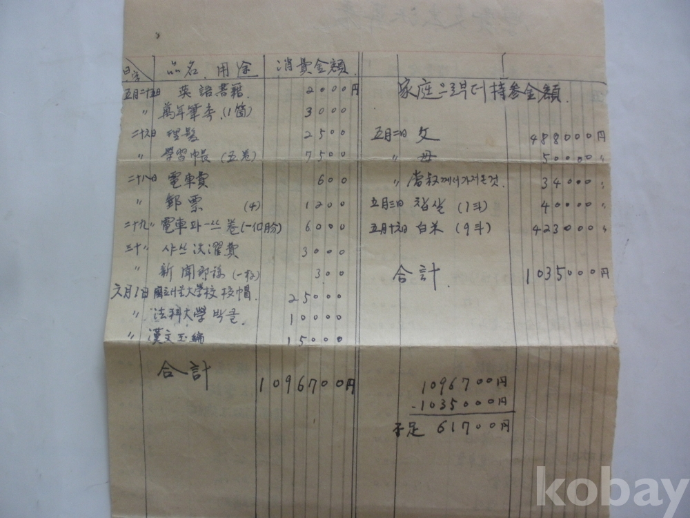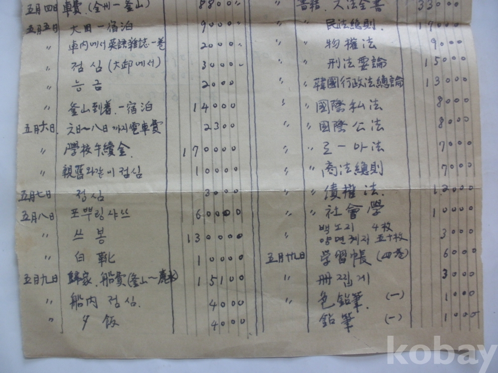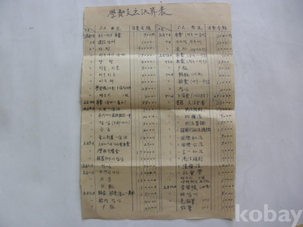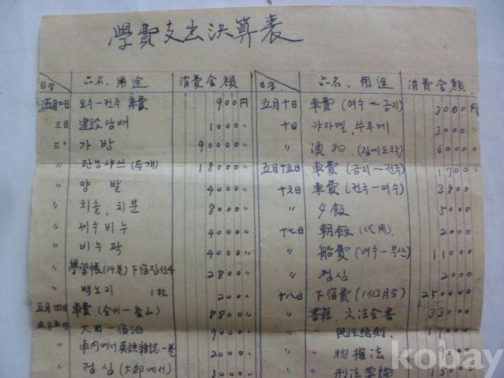 학비 지출 결산표 - 차비 (여수~금지), 건설 담배, 학습장 하숙집 선사, 선비(여수~부산), 형법요