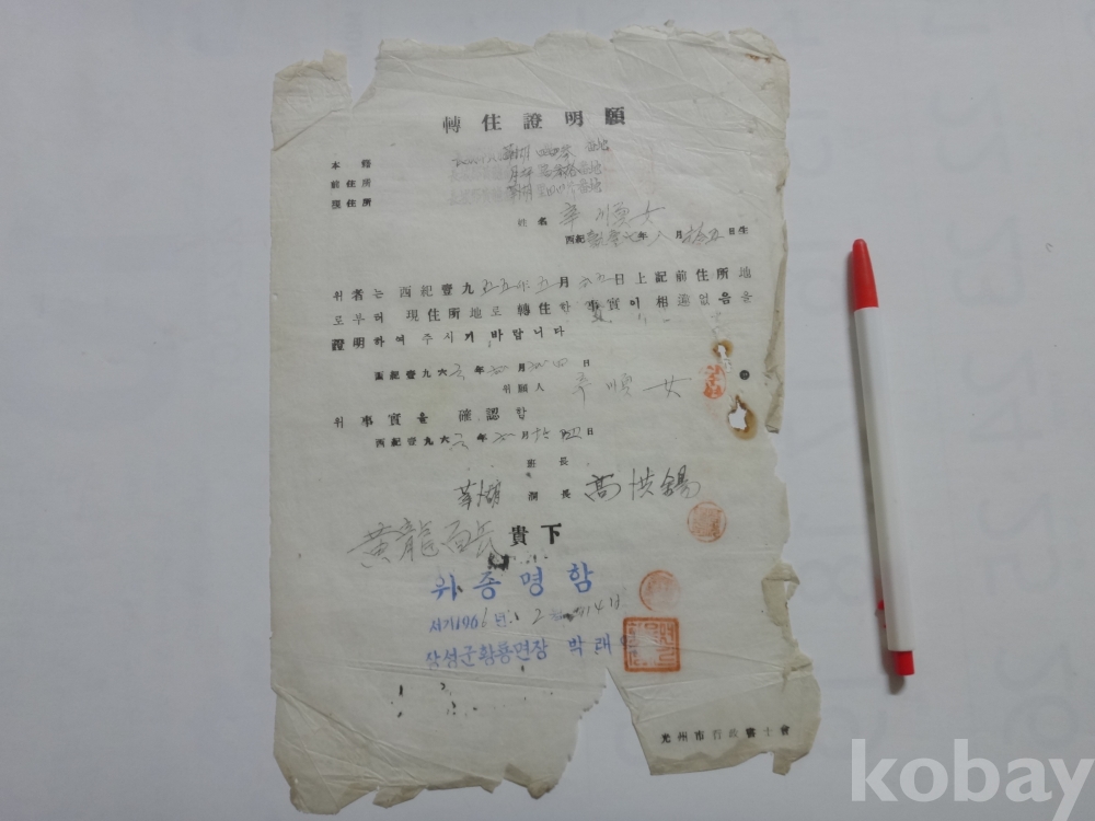 주소지 - 전주 (轉住) 증명원 (1966년, 장성군 황룡면장)