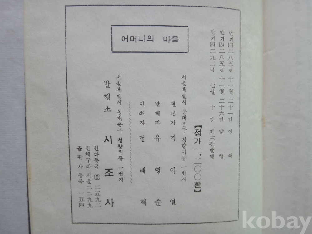 어머니의 마음 - "헤랄드"와 그 어머니의 사랑 등 (1959년, 시조사)