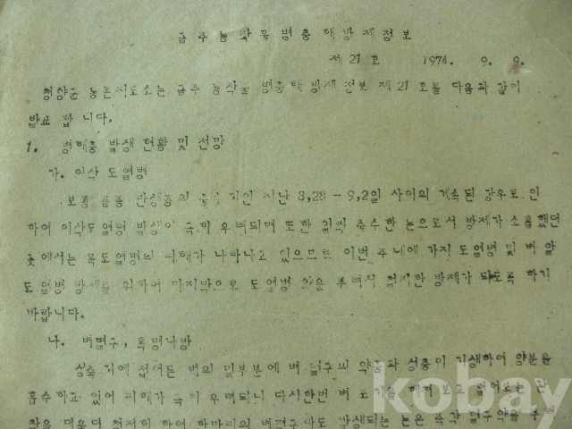 금주 농작물 병충해 방제 정보 - 이삭 도열병, 벼 멸구, 혹명나방 등 (1974년, 청양군 농촌지도소)