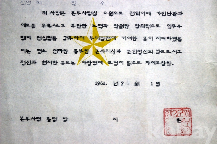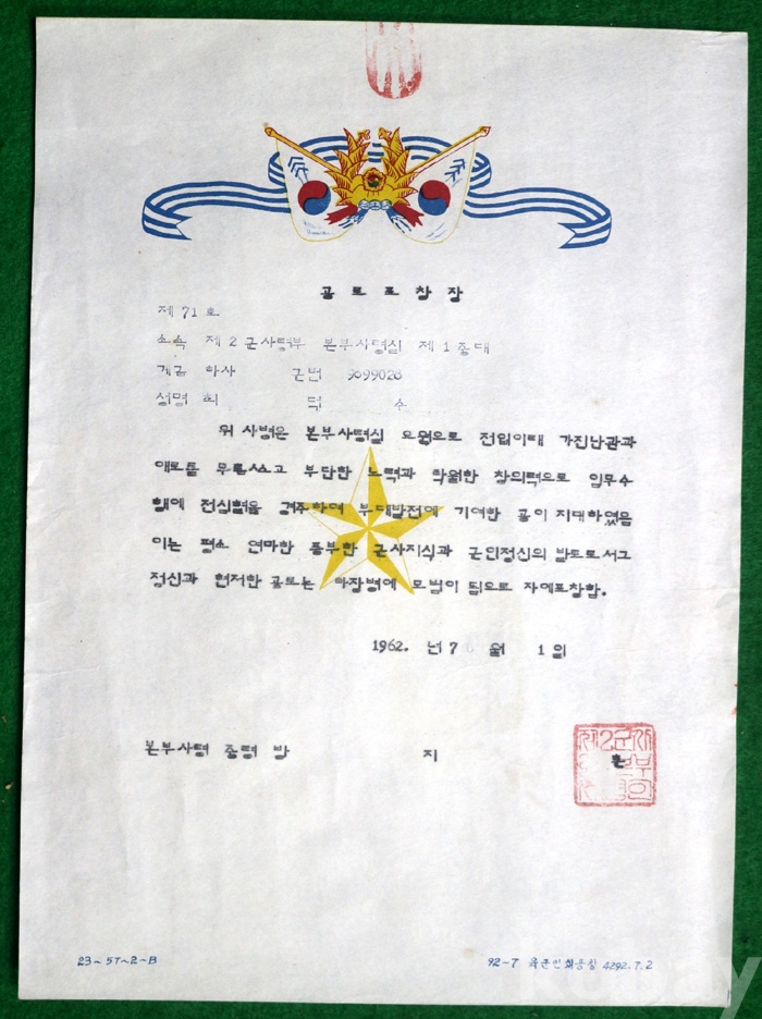(상장 및 졸업장) 1962년 본부사령 방지훈 중령이 준 공로표창장